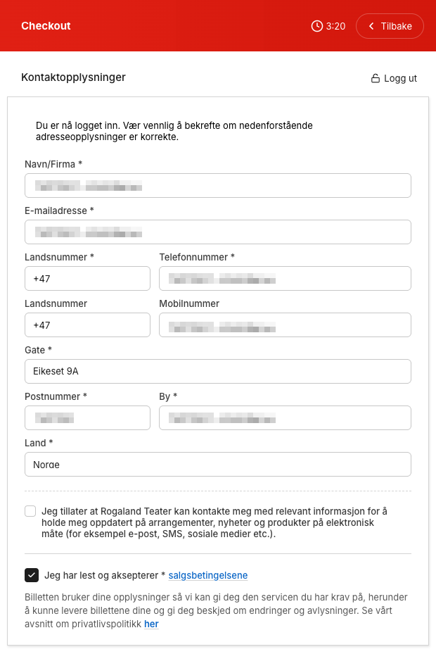 Husk å huke av for at du har lest og akseptert salgsbetingelsene, og hvis du ikke allerede er på nyhetsbrevslisten vår anbefaler vi at du krysser av for det i samme slengen så er du sikret å få informasjon, forhåndskjøp og andre godbiter fra oss.