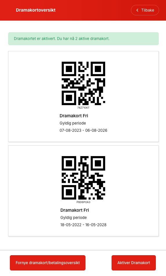 Når du har aktivert kortene får du opp en oversikt slik at du kan se om du har fått med alle kort. Har du glemt noen kan du fortsatt aktivere Dramakort her. Trykk på «Tilbake» – for å legge inn eventuelle Dramakort som mangler.