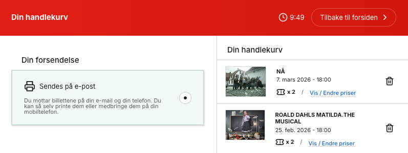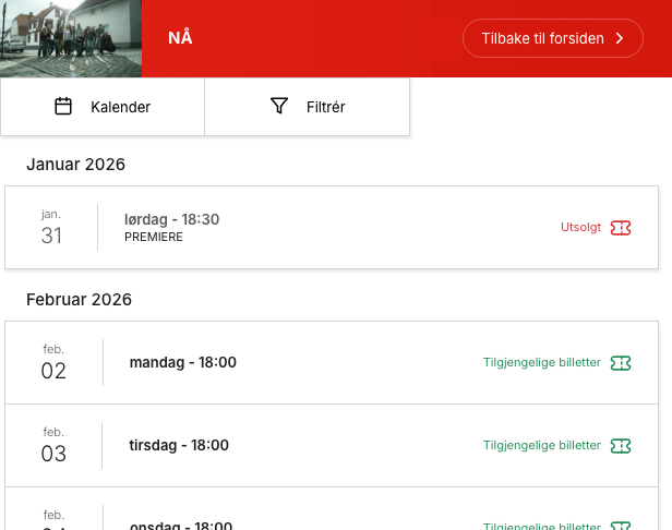 Har du fått med deg alle trykker du «Tilbake til forsiden» oppe til høyre, så kan du gå i gang og bestille til forestillingene.