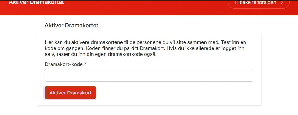 Hvis du skal bestille billetter til flere Dramakortholdere aktiverer du alle kortene FØR du begynner å bestille billetter. Trykk på knappen som heter «Aktiver Dramakort» inne på din side.
